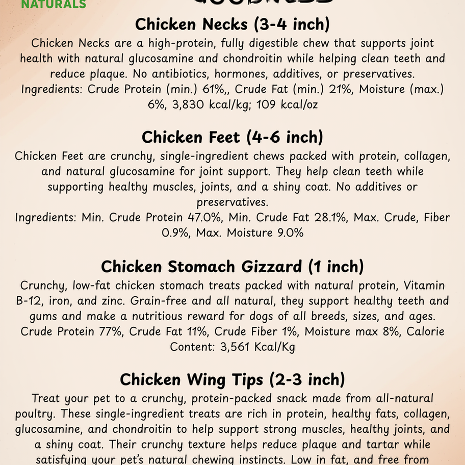 Chicken Necks are a high-protein, fully digestible chew that supports joint health with natural glucosamine and chondroitin while helping clean teeth and reduce plaque. No antibiotics, hormones, additives, or preservatives.